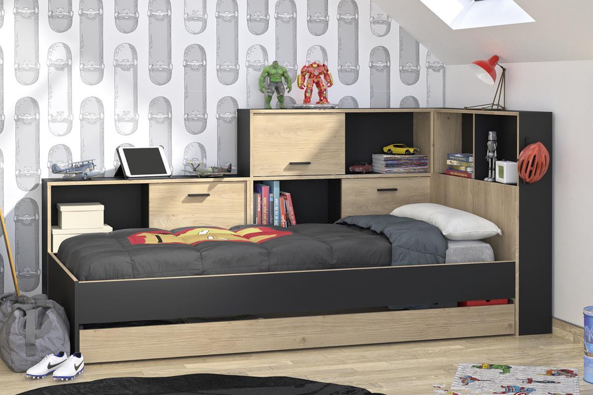 Met het Tonight tienerbed 90/200 hoef je echt niet te wachten tot het avond is. Dit prachtige bed is gemaakt van hoogwaardig eiken en grijs kwaliteitsspaanplaat en ziet er fantastisch uit. Naast zijn stijlvolle uitstraling biedt dit bed veel handige opbergruimte, waardoor het zowel stijlvol als functioneel is. Het wordt geleverd met een ruime opberglade (30 cm diep), schuifdeurkastjes en open vakken, zodat je al je spullen netjes kunt opbergen. Bovendien kan het bed in spiegelbeeld worden opgebouwd, afhankelijk van je voorkeur.