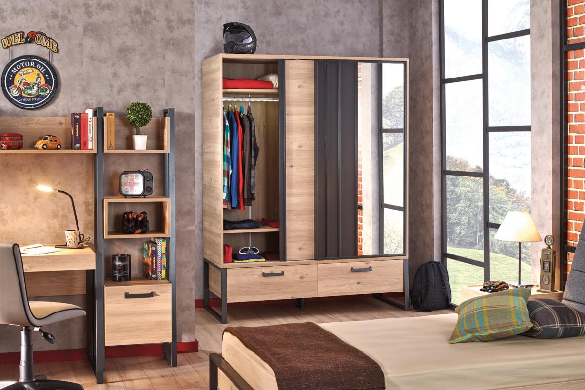 Deze super stoere jongenskamer is echt te gek! De meubels zijn stoer en passen perfect bij elkaar. Deze tienerkamer wil jij toch ook? Dankzij de combinatie aan kleuren en materialen zijn de meubels zeer stijlvol. De Irony serie bestaat uit de volgende meubels voor in de slaapkamer: een ledikant 90/200 recht, een ledikant 90/200, een ledikant 120/200, een 3-deurs kledingkast, een schuifdeur kledingkast, een boekenkast, een bureau-N, een bureau, een nachtkastje, een ladekast, een spiegel en een wandkast. Alle meubels zijn individueel verkrijgbaar maar komen natuurlijk het beste tot hun recht als ze met elkaar gecombineerd worden.