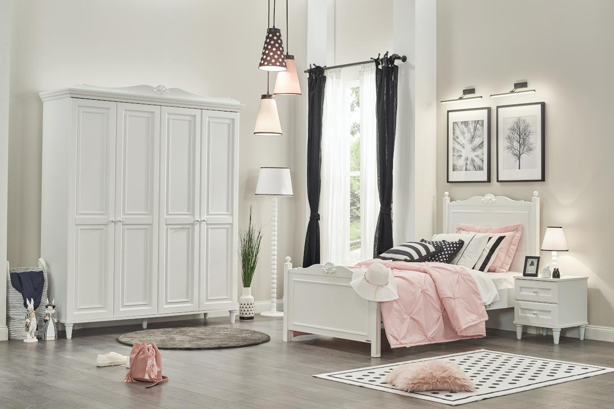 Deze prachtige meubels van de Lora serie mogen niet ontbreken in de slaapkamer! Ze zijn vervaardigd in mooi neutraal wit en van stevige kwaliteit. De Lora serie bestaat uit een ledikant 90/200, een hemelbed 90/200 inclusief stof, een ledikant 120/200, een hemelbed 120/200 inclusief stof, een slaaplade, een nachtkastje, een 3-deurs kledingkast, een 4-deurs kledingkast, een bureau, een opbouw voor op het bureau, een boekenkast, een ladekast, een spiegel, een hanglamp, een tafellamp en een poef. De prachtige Lora meubels zijn los verkrijgbaar, maar de meubels komen het beste tot hun recht als ze samen gecombineerd worden in de slaapkamer.