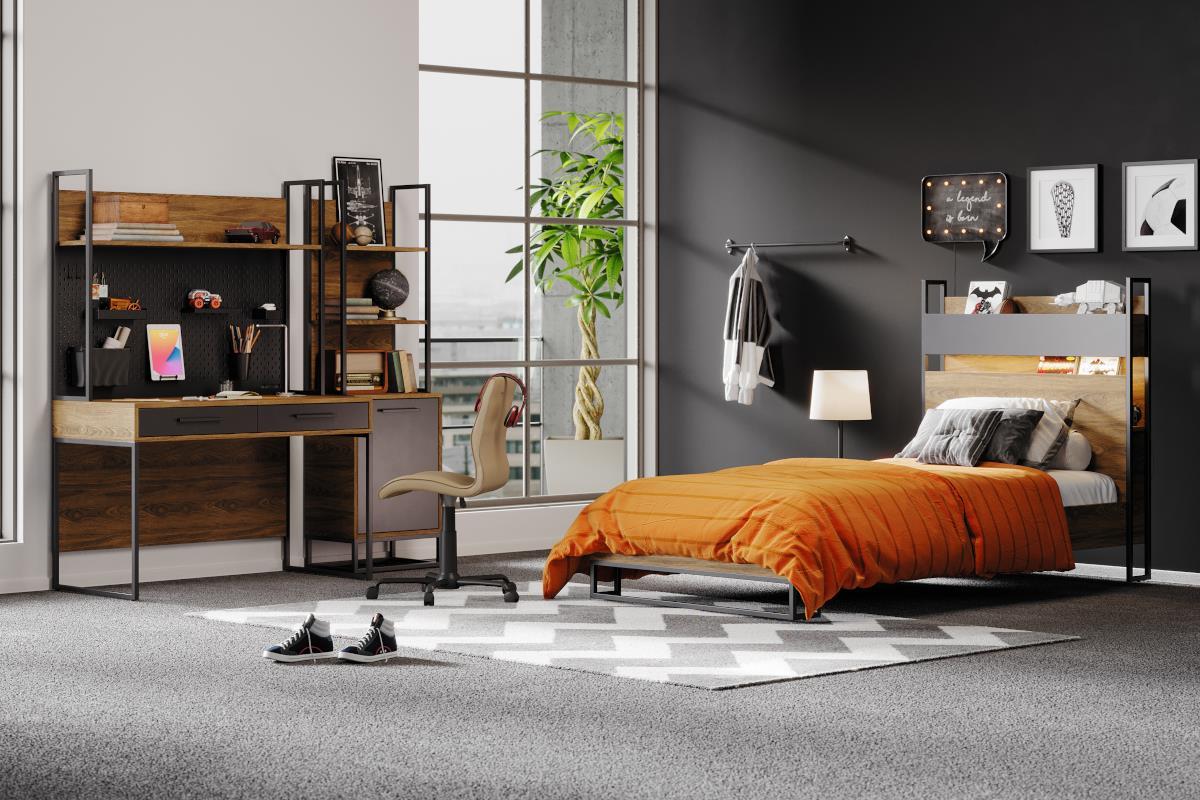 Het New Legend Bed 90/200 in grijs en walnoot is een stoere eyecatcher voor de kinder- of tienerkamer. Ontdek het antraciet metalen frame en de praktische opbergvakken!