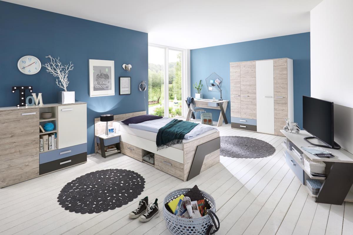 De Nona tienerkamer is mooi modern, neutraal en toch een beetje kleurrijk! Kijk snel verder! De meubels zijn prachtig om te zien dankzij de kleurencombinatie wit, lichtblauw en basalt grijs. Verder zijn sommige panelen van de meubels gecoat met een steigerhouten print. Hierdoor krijgen de meubels een stoere look. De metalen handgrepen op de meubels passen perfect bij het moderne uiterlijk van de meubels. De serie, perfect om in één keer stijlvol de slaapkamer in te richten, bestaat uit de volgende meubels: een kajuitbed 90/200, een nachtkastje, een 4-deurs kledingkast, een bureautafel, een commode en een TV-meubel. De meubels zijn los verkrijgbaar of in een voordelige 4-delige set of 6-delige set.