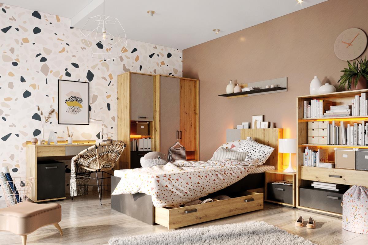 De Qubic meubelserie combineert robuust artisan oak met stoer raw steel voor een industriële uitstraling die perfect past bij de kinderkamer of tienerkamer. Met strakke lijnen, stevige materialen en een stijlvolle afwerking biedt Qubic een ideale mix van functionaliteit en design. Van comfortabele bedden tot praktische kasten en bureaus – deze serie is perfect om een eigentijdse en stoere kamer in te richten. Kies Qubic voor een kamer met karakter en duurzaamheid!